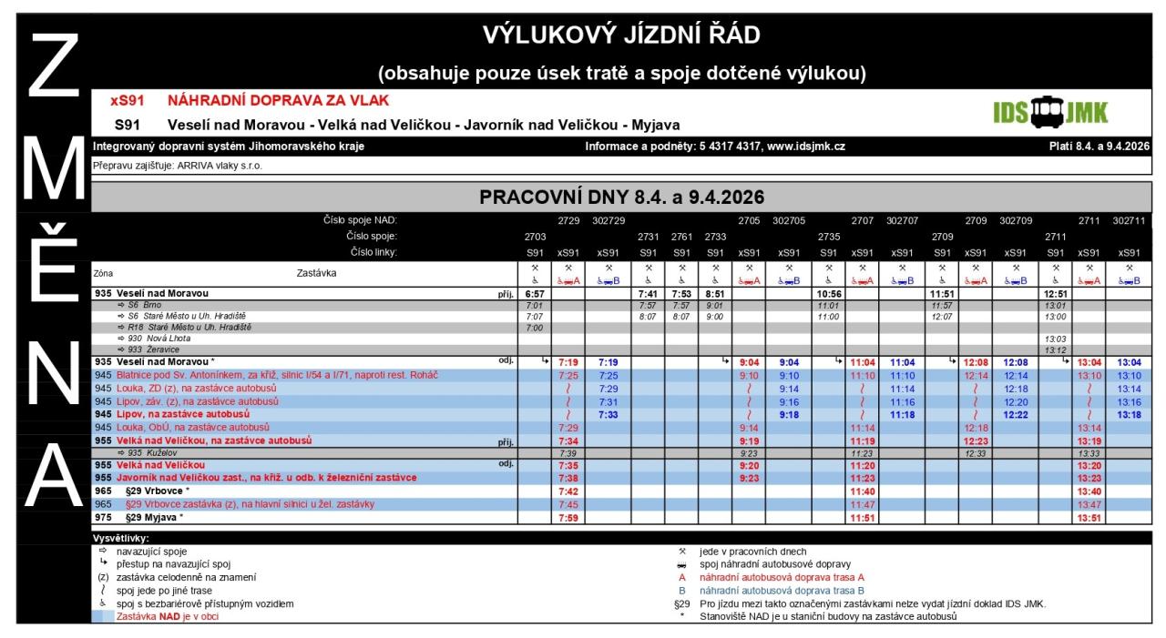 Tá sa bude realizovať z dôvodu zvýšenia komfortu a bezpečnosti železničnej dopravy v úseku Myjava – Veselí nad Moravou v dňoch streda 8. a štvrtok 9. apríla 2026 v čase od 7.20 do 14.05 h. Z tohto dôvodu bude zavedená náhradná autobusová doprava (NAD) v celom úseku Myjava – Veselí nad Moravou pri vlakoch 2729, 2707, 2711, 2706, 2710 a 2714. Pozor, NAD za vlak 2729 ide v iných časových polohách ako chodí samotný vlak (viď výlukový cestovný poriadok).