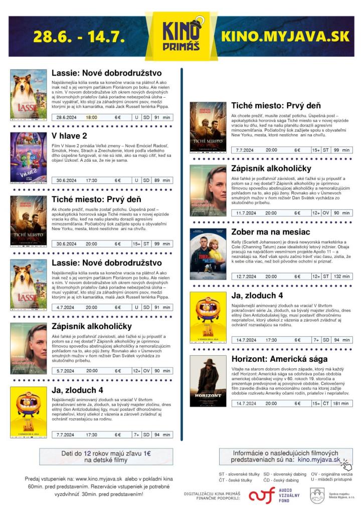 Pripomíname, že všetky informácie o programe, upútavky na filmy, anotácie a predpredaj vstupeniek nájdete na portáli www.kino.myjava.sk.
