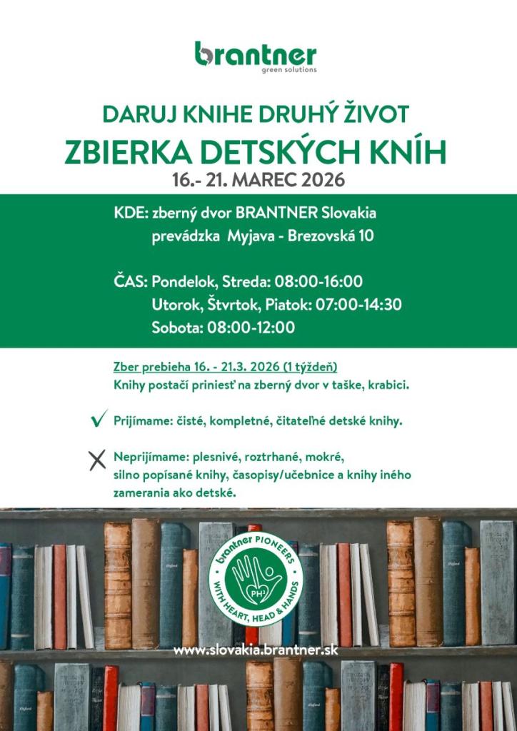 Zber detských kníh bude realizovaný v týždni od 16. do 21. marca 2026 v zbernom dvore na Brezovskej ulici č. 10 v Myjave. V rámci prevádzkových hodín, čiže v pondelok a stredu v čase od 8.00 do 16.00 h, v utorok, štvrtok a piatok v čase od 7.00 do 14.30 h a napokon v sobotu v čase od 8.00 do 12.00 h, tu bude možné odovzdať v taške alebo v škatuli rozprávky, detské príbehy, leporelá, detské encyklopédie alebo náučné knihy. Dôležité je, aby knihy boli zachovalé, kompletné, čisté a čitateľné. Určite nenoste knihy, ktoré nie sú určené detským čitateľom, sú roztrhané, počmárané, plesnivé či inak poškodené. Knihy po zbere pracovníci spoločnosti skontrolujú a následne ich budú distribuovať napríklad do nemocníc (detské kútiky, čakárne, oddelenia, školské učiarne pre hospitalizované deti), do knižníc, prípadne ďalších vhodných miest.