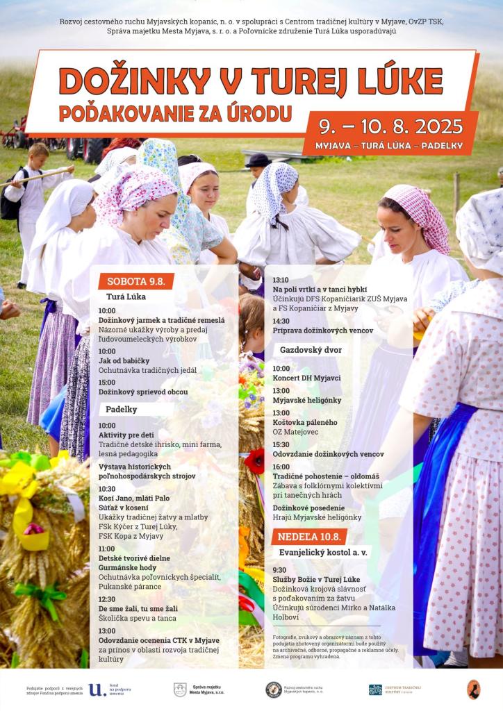 Program sa začne v sobotu 9. augusta 2025 o 10.00 h Dožinkovým jarmokom, koncertom Dychovej hudby Myjavci, ukážkami tradičných remesiel, ochutnávkou regionálnych špecialít Jak od babičky v Turej Lúke a aktivitami pre deti v Padelkoch. Pre tie budú v areáli pripravené tradičné detské ihrisko, minifarma i lesná pedagogika. Nebude chýbať ani výstava poľnohospodárskych strojov.
