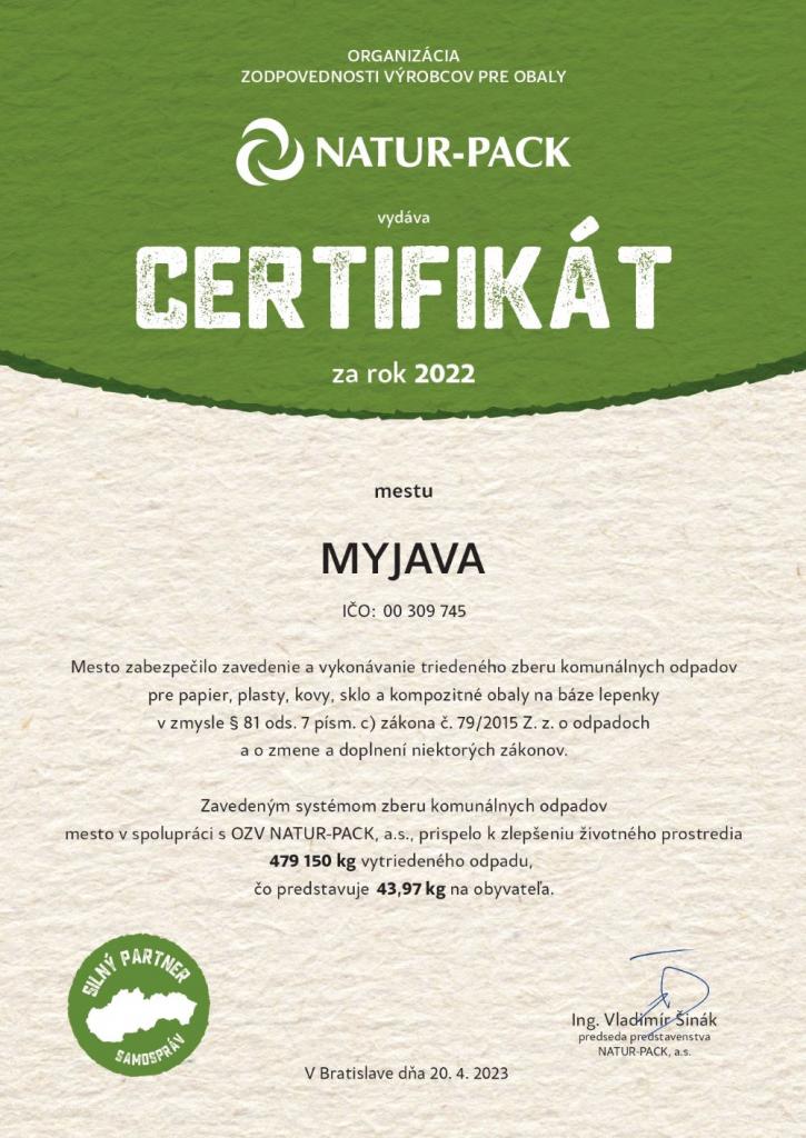 Spoločnosť NATUR-PACK, a. s., Bratislava ako autorizovaná organizácia zodpovednosti výrobcov nám v nedávno doručenej správe poďakovala za prejavenú dôveru a spoluprácu v roku 2022 pri zabezpečovaní triedeného zberu komunálnych odpadov pre papier, plasty, kovy, sklo a kompozitné obaly na báze lepenky v zmysle § 81 ods. 7 písm. c) zákona č. 79/2015 Z. z. o odpadoch a o zmene a doplnení niektorých zákonov a zaslala nám certifikát s údajom o množstve komunálnych odpadov, ktoré bolo na území Myjavy vytriedené v roku 2022. Išlo o 479 150 kg vyseparovaného odpadu, čo predstavuje 43,97 kg na obyvateľa. V roku 2021 to bolo síce viac, okolo 48 kg na obyvateľa, ale tu treba brať do úvahy napríklad výkup plastových fliaš, ktorých podiel sa vo vyseparovaných zložkách odpadu výrazne znížil či napríklad to, že údaje nezahŕňajú odpad odovzdaný v rámci výkupu v zberných surovinách. Keď sa pozrieme na mieru separácie, tá sa o čosi zlepšila. Kým v roku 2021 sme dokázali na Myjave vytriediť 57,13% odpadu, v roku 2022 to bolo 61,35%. Dúfame a veríme, že spoločnými silami a uvedomelým prístupom sa nám bude dariť tieto čísla stále zlepšovať. Ďakujeme všetkým vám, ktorí k triedeniu odpadových komodít pristupujete zodpovedne!