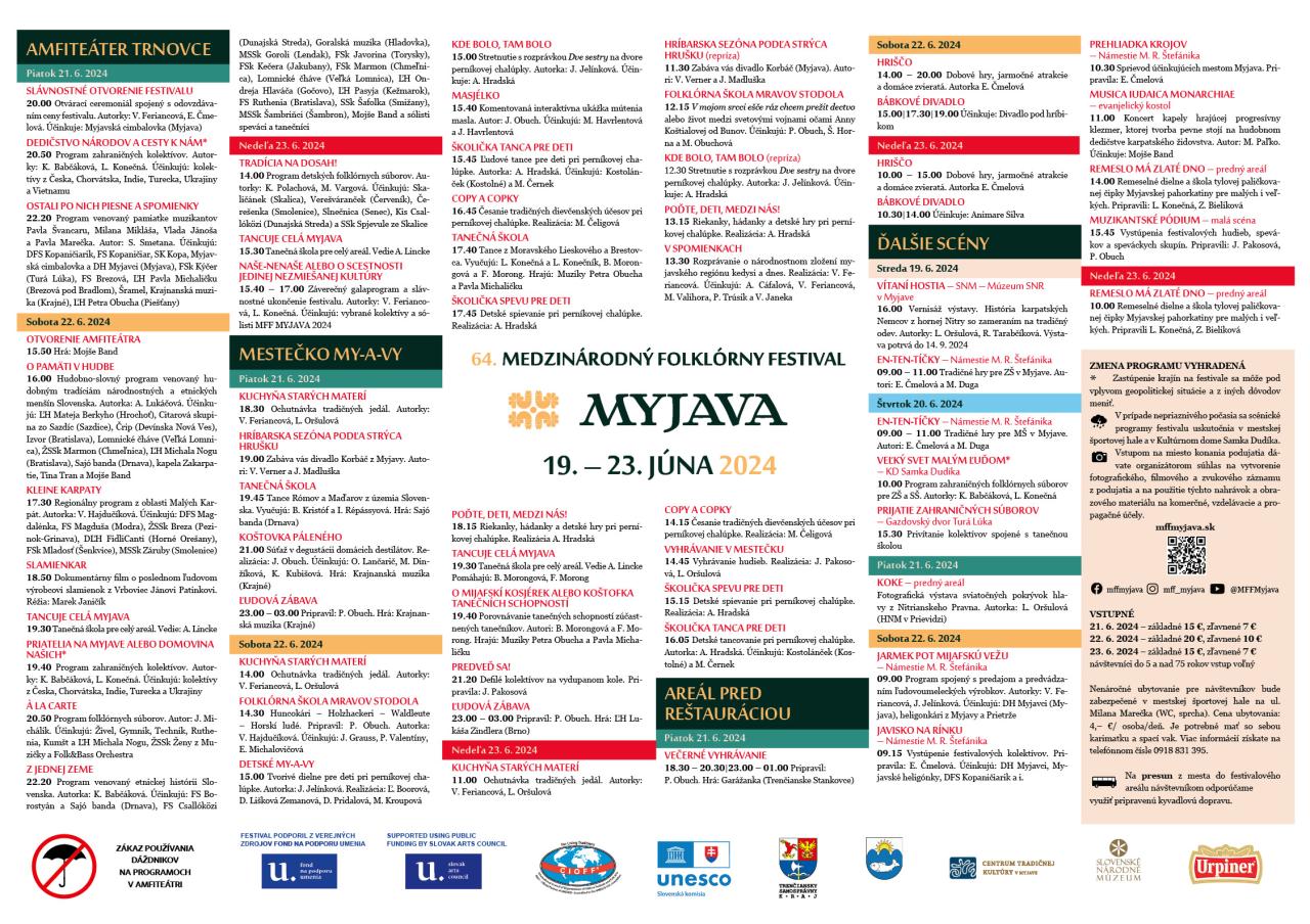 Festivalový areál Trnovce začne ožívať o 14.00 h v Mestečku MY-A-VY a s ním aj Kuchyňa starých materí – ponuka regionálnych špecialít (nielen) z rôznych kútov Slovenska. Deti sa zasa môžu tešiť v mestečku na rozprávky, školičku tanca a spevu, česanie tradičných účesov a tiež Hriščo a bábkové divadlo v areáli pred reštauráciou. Programy v amfiteátri začnú o 15.30 h Otvorením amfiteátra so skupinou Mojše band. Po nich bude pódium patriť hudobným tradíciám národnostných a etnických menšín Slovenska v pásme O pamäti, v ktorom sa predstavia ĽH Mateja Berkyho (Hrochoť), Citarová skupina zo Sazdíc (Sazdice), Črip (Devínska Nová Ves), Izvor (Bratislava), Lomnické čháve (Veľká Lomnica), ŽSSk Marmon (Chmeľnica), ĽH Michala Nogu (Bratislava), Sajó banda (Drnava), kapela Zakarpatie, Tina Tran a opäť Mojše Band. O 17.30 h sa na javisku začne regionálny program z oblasti Malých Karpát nazvaný Kleine Karpaty vyskladaný z vystúpení DFS Magdalénka, FS Magduša (Modra), ŽSSk Breza (Pezinok-Grinava), DĽH FidliCanti (Horné Orešany), FSk Mladosť (Šenkvice) a MSSk Záruby (Smolenice). 18.50 h si na pripravenej veľkoplošnej obrazovke pozrieme vydarený krátky dokument Slamienkar o poslednom ľudovom výrobcovi slamienok z Vrboviec, Jánovi Patinkovi. No a po roztancovaní všetkých na javisku i v hľadisku v rámci tanečnej školy pre celý festivalový areál nazvanej Tancuje celá Myjava začne o 19.40 h program zahraničných súborov Priatelia na Myjave alebo Domovina našich. O 20.50 h je naplánovaný program venovaný etnickej histórii Slovenska s názvom Á la carte a o 22.20 h odštartuje pásmo Z jednej zeme s účasťou súborov FS Borostyán a Sajó banda (Drnava), FS Csallóközi (Dunajská Streda), Goralská muzika (Hladovka), MSSk Goroli (Lendak), FSk Javorina (Torysky), FSk Kečera (Jakubany), FSk Marmon (Chmeľnica), Lomnické čháve (Veľká Lomnica), ĽH Ondreja Hlaváča (Gočovo), ĽH Pasyja (Kežmarok), FS Ruthenia (Bratislava), SSk Šafolka (Smižany), MSSk Šambriňci (Šambron), Mojše Band a ďalších sólistov spevákov a tanečníkov. Komu sa bude po skončení programov v amfiteátri ľudovej kultúry stále máliť, môže sa presunúť do Mestečka MY-A-VY na Ľudovú zábavu s Ľudovou hudbou Lukáša Zindlera z Brna.