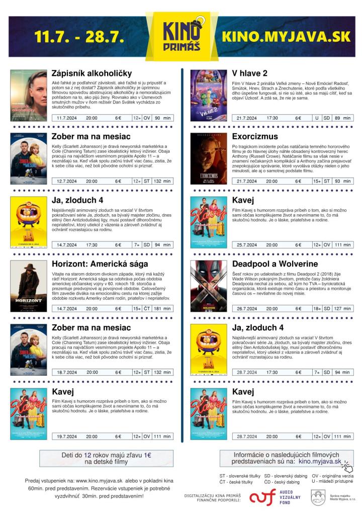 Napríklad najnovší režisérsky počin Dana Svátka s Terezou Rambou v hlavnej úlohe s názvom Zápisník alkoholičky, romantickú komédiu so Scarlett Johansson a Channingom Tatumom nazvanú Zober ma na mesiac, či vysnívaný westernový epos Kevina Costnera - Horizont: Americká sága. Na letnú zábavnú a pohodovú vlnu je naladená slovenská komédia vychádzajúca z úspešného internetového seriálu Kavej a kto sa v kine rád bojí, ten si môže prísť pre zmenu vychutnať horor s Russellom Croweom - Exorcizmus. Fanúšikov drsného superhrdinského humoru poteší spoločný film kultových komiksových postáv Deadpool a Wolverine, no a pre mladšie publikum sú určené animáky V hlave 2 a Ja, zloduch 4.