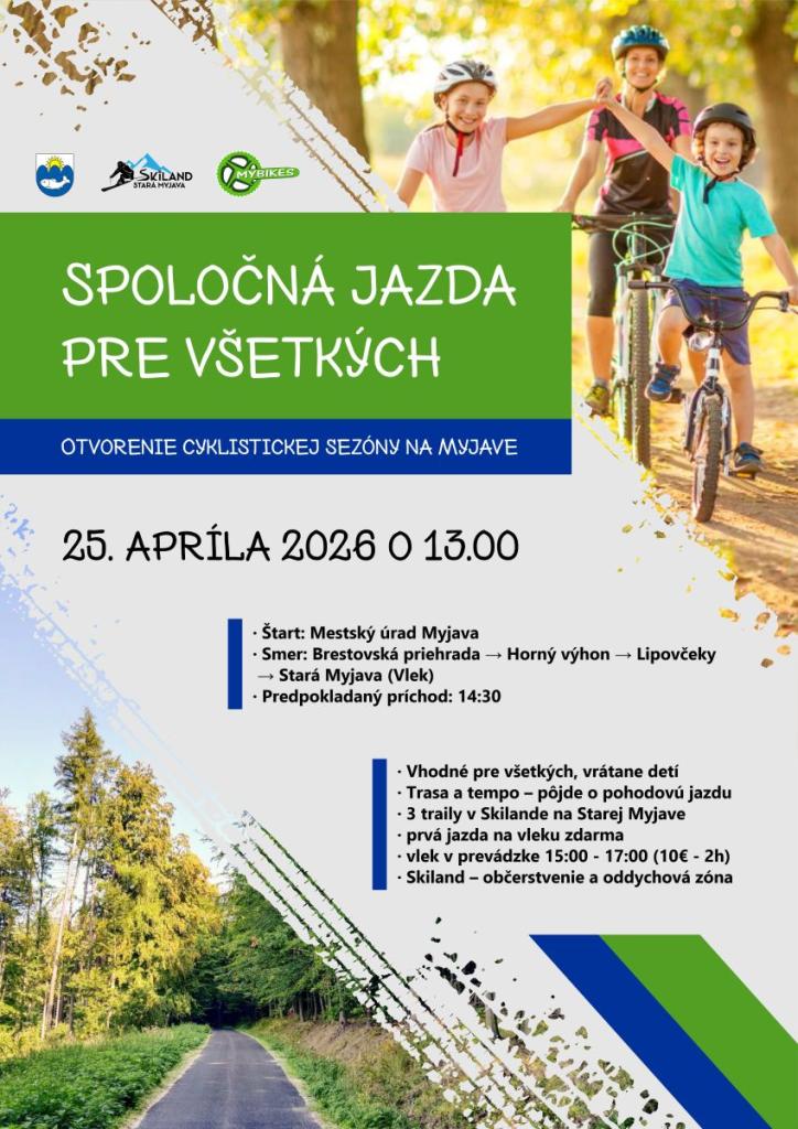 Tá sa bude konať v sobotu 25. apríla 2026 o 13.00 h. Pripravujú ju mesto Myjava, SKILAND Stará Myjava a predajňa MY BIKES. Štart bude pri mestskom úrade, odkiaľ sa účastníci jazdy - podobne ako pred rokom - vyberú smerom do Brestovca, ďalej na Horný výhon, Lipovčeky a zídu k lyžiarskemu vleku na Starej Myjave. Pri zjazdovke bude pre cyklistov pripravené občerstvenie a jazdy na trailoch s inštruktorom. Cyklistov bude sprevádzať Mestská polícia Myjava.