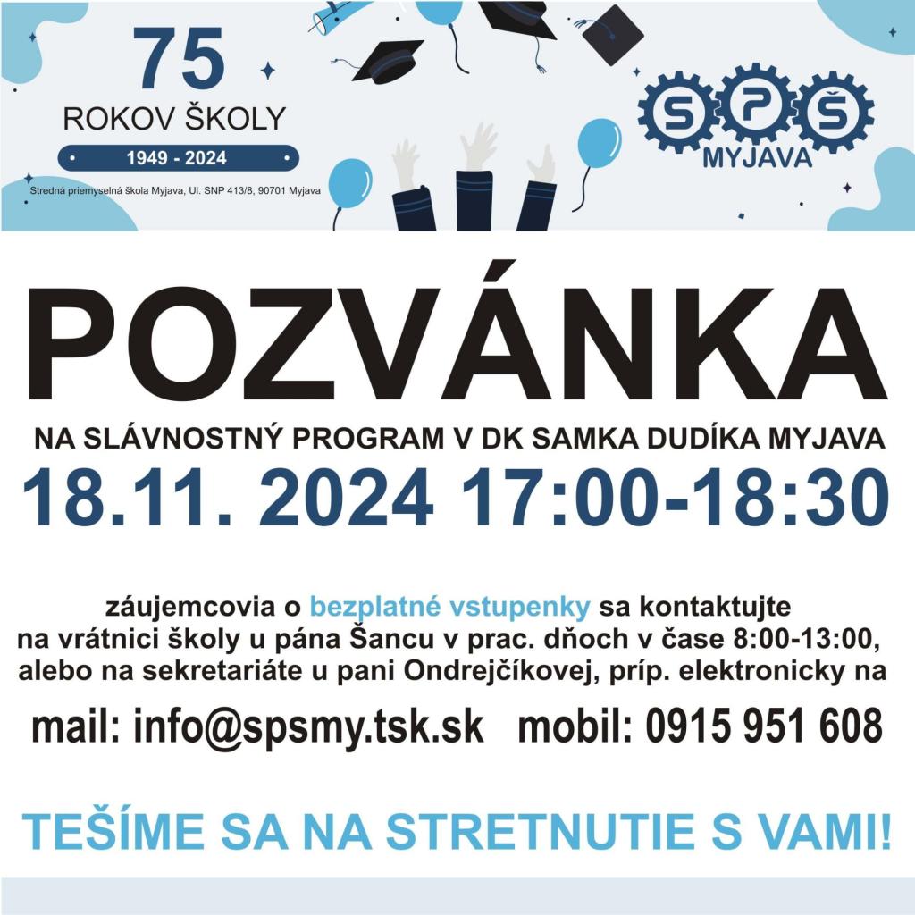 Čo je ale teraz podstatné, tieto svoje "narodeniny" škola oslávi slávnostnou akadémiou v Kultúrnom dome Samka Dudíka v Myjave. A to v pondelok 18. novembra 2024 o 17.00 h. Okrem pozvaných hostí sa pripravovaného programu môžete zúčastniť aj vy, no pre obmedzenú kapacitu sály je potrebné svoju účasť vopred nahlásiť. A to buď telefonicky na čísle 0915 951 608 alebo mailom na adrese info@spsmy.tsk.sk.