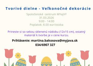Oddelenie sociálnych služieb mesta Myjava srdečne pozýva záujemcov na Tvorivé dielne, na ktorých si môžu vyrobiť vlastné veľkonočné dekorácie a užiť si kreatívny deň v príjemnej atmosfére.