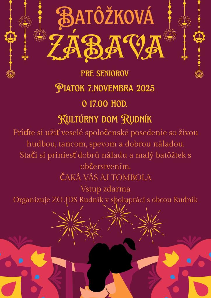 Batôžková zábava pre seniorov, ktorá sľubuje dobrú zábavu pri živej hudbe, tanci a speve vo veselej spoločnosti. Povinnou výbavou je dobrá nálada a malý batôžtek s občerstvením.