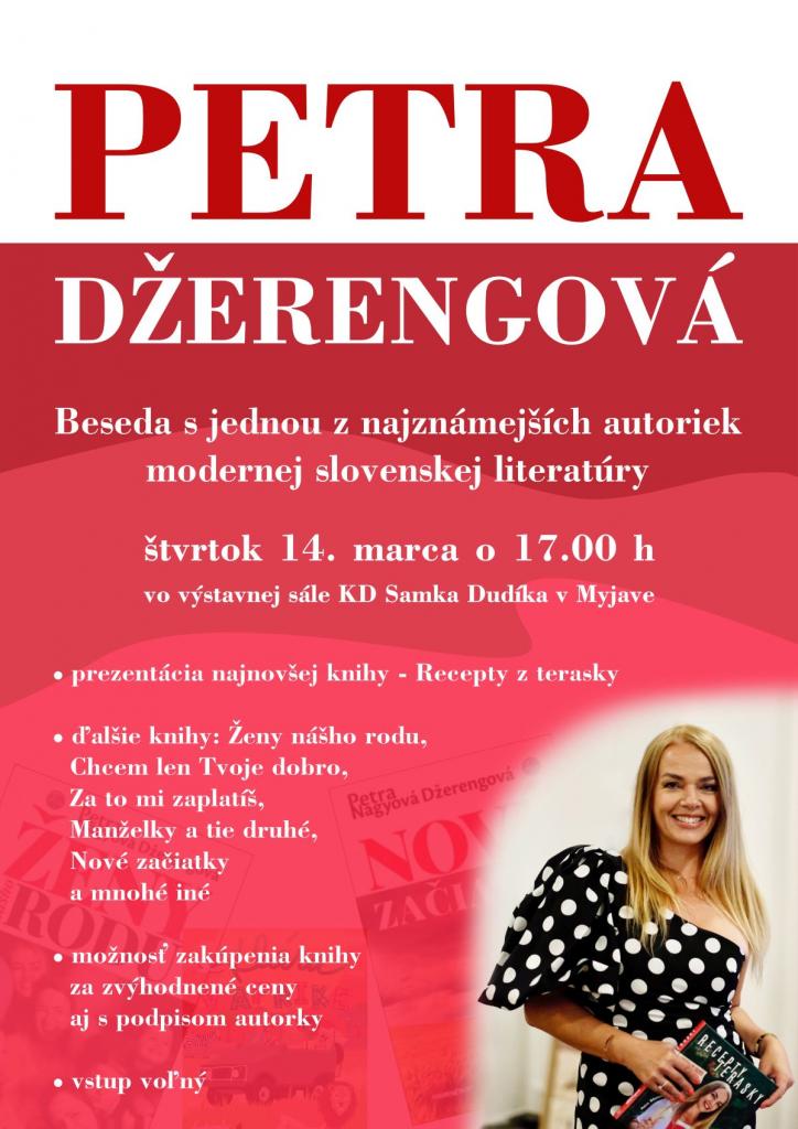 Petra nám na Myjave predstaví nielen svoju najnovšiu knihu s názvom Recepty z terasky, ale budeme sa venovať aj jej románom pre dospelých a nezabudneme ani na knihy pre deti, ktoré má na konte v tejto chvíli štyri.