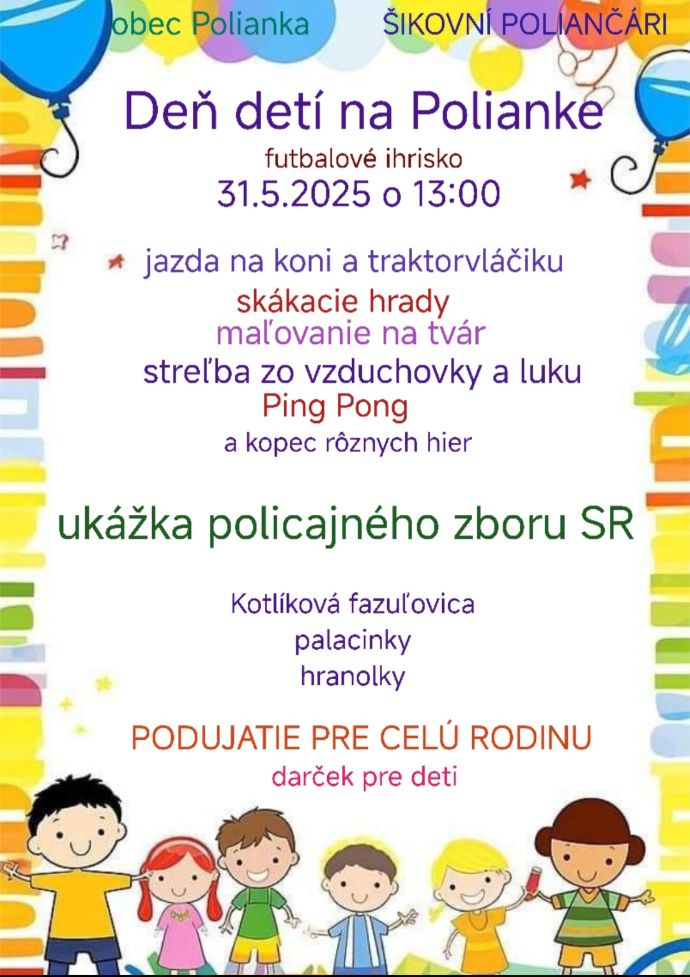 Obľúbené podujatie, ktoré organizujú obec Polianka a Šikovní Poliančari, ponúkne aj tento rok návštevníkom atraktívny a zaujímavý program. Deti sa môžu tešiť napríklad na jazdu na koni, traktor - vláčik, budú si môcť zastrieľať z luku a zo vzduchovky, zahrať si ping-pong alebo sa vyskákať na nafukovacích hradoch. Pripravených bude množstvo hier a súťaží a na každé dieťa bude čakať malý darček. Návštevníkov zasýtia domáca fazuľovica, palacinky, hranolčeky. Veľkým lákadlom bude aj ukážka Policajného zboru Slovenskej republiky.