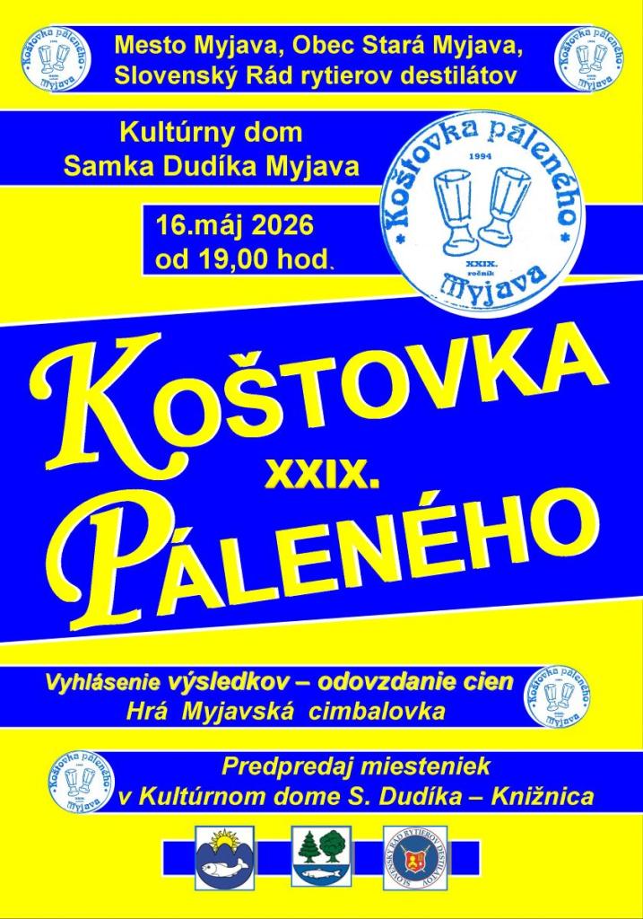 Slovenský rád rytierov destilátov, obec Stará Myjava a mesto Myjava vás pozývajú na 29. ročník Koštovky páleného. Tá sa bude konať v Kultúrnom dome Samka Dudíka v Myjave v sobotu 16. mája 2026 o 19.00 h.