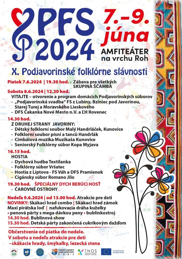 Pokračovať bude v sobotu 8. júna 2024 od 12.30 h pásmom domácich folklórnych súborov a skupín z Lubiny, Bziniec pod Javorinou, Starej Turej a Moravského Lieskového. Predstaví sa tu aj DFS Čakanka z Nového Mesta nad Váhom a ĽH Rovenec.