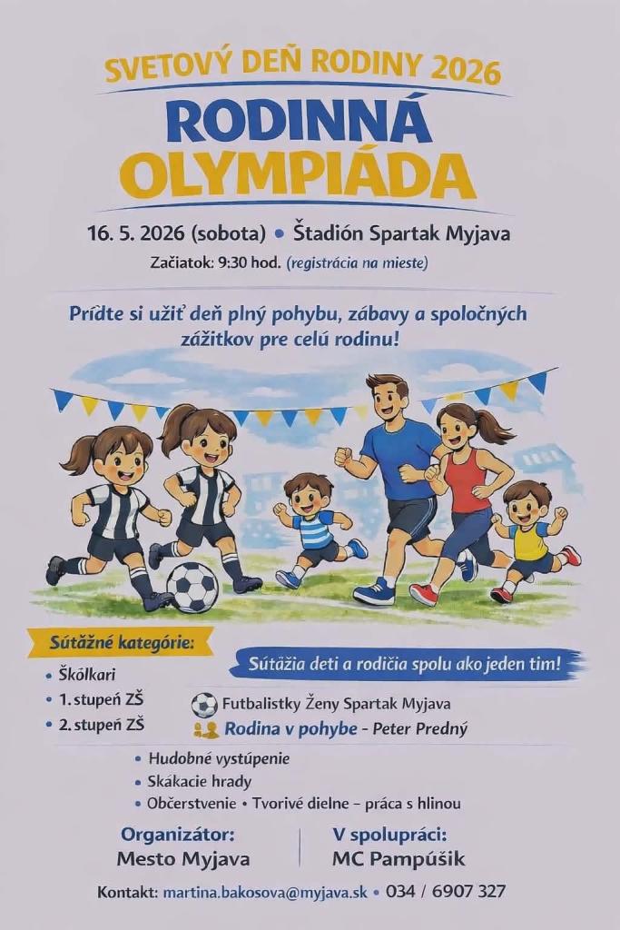 Mesto Myjava v spolupráci s Materským centrom Pampúšik srdečne pozýva všetky deti, rodičov a priateľov športu na dopoludnie plné energie a spoločných zážitkov. Pri príležitosti Svetového dňa rodiny sa v sobotu 16. mája 2026 uskutoční v areáli štadióna Spartaka Myjava podujatie s názvom Rodinná olympiáda.