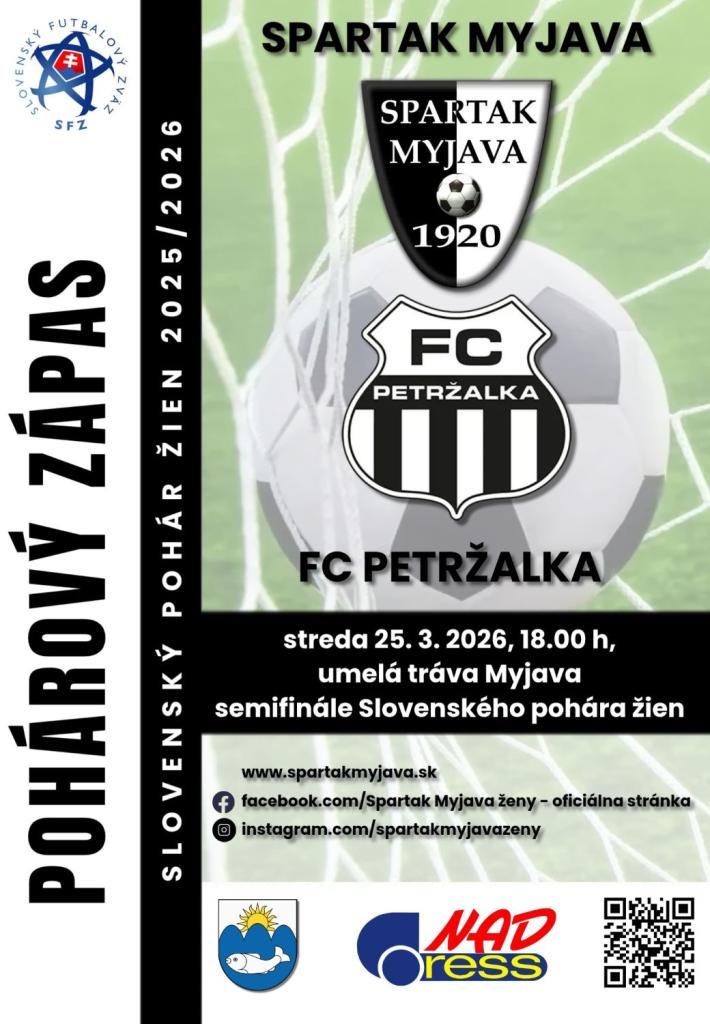 Spartak Myjava vás srdečne pozýva na semifinálový zápas Slovenského pohára žien, ktorý sa uskutoční v utorok 25. marca 2026 o 18.00 h na ihrisku s umelou trávou v Myjave.