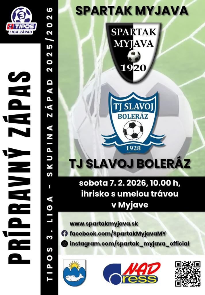 Súperom Spartaka bude tím TJ Slavoj Boleráz. Duel sa bude konať v sobotu 7. februára 2026 o 10.00 h na ihrisku s umelou trávou v Myjave. Bufet bude k dispozícií.
