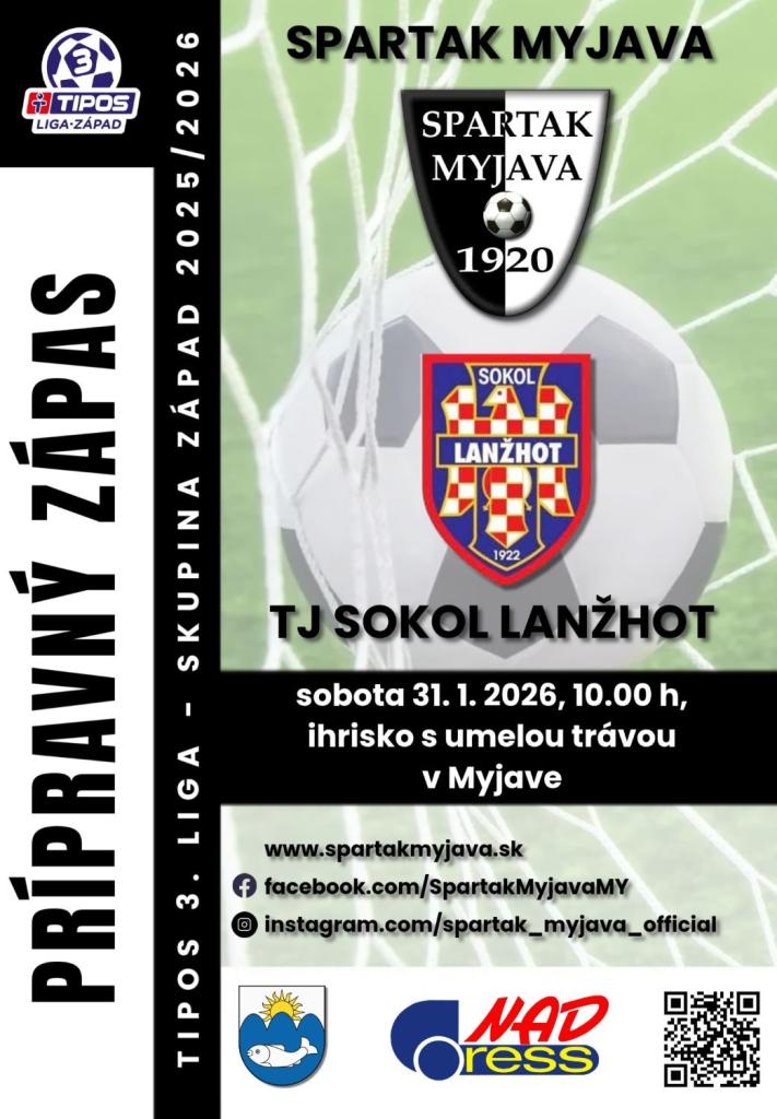 Spartak Myjava vás srdečne pozýva na tretí prípravný zápas mužov v zimnej prestávke TIPOS 3. ligy - skupiny Západ 2025/2026. Súperom Spartaka bude tím TJ Sokol Lanžhot.
