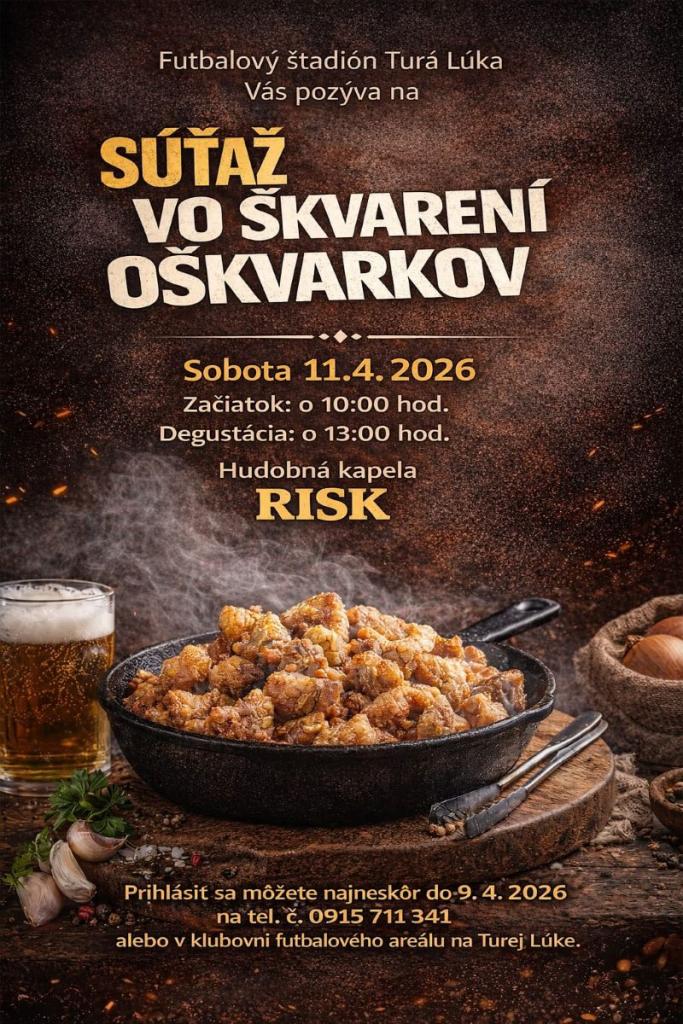Degustácia oškvarkov je plánovaná od 13.00 h a atmosféru podujatia bude dotvárať vyhrávanie hudobnej skupiny RISK. Súťažiace tímy sa môžu prihlasovať do štvrtka 9. apríla 2026 na tel. čísle 0915 711 341 alebo priamo v klubovni turolúckeho štadióna u pani Bednárovej.