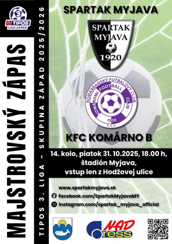 V ňom sa futbalisti Spartaka Myjava stretnú s tímom KFC Komárno B. Stretnutie sa uskutoční na myjavskom štadióne v piatok 31. októbra 2025 o 18.00 h. Príďte povzbudiť našich hráčov v tomto dôležitom dueli!