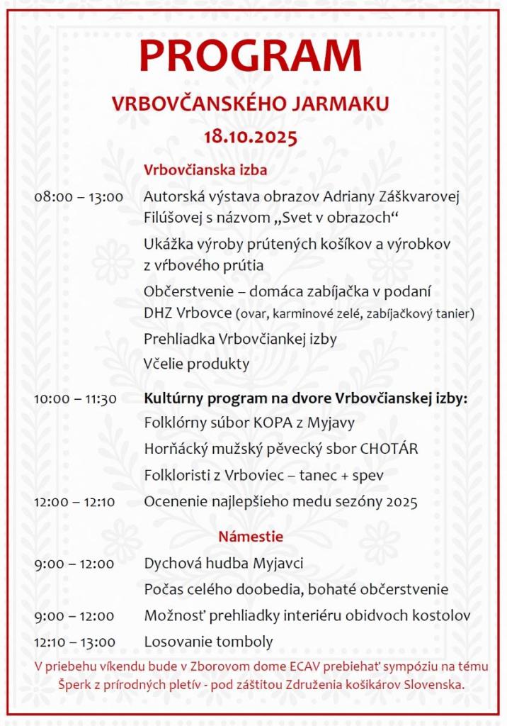 Na dvore Vrbovčianskej izby sa od 10.00 h predstavia Folklórny súbor Kopa z Myjavy, Horňácky mužský pěvecký sbor Chotár aj folkloristi z Vrboviec. Na 12.00 h zasa organizátori chystajú ocenenie najlepšieho medu sezóny 2025.