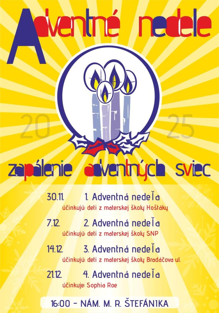 - Prvá adventná nedeľa, 30. 11. 2025, 16.00 h - Deti z Materskej školy Bradáčova ul. - elokované pracovisko Hoštáky
