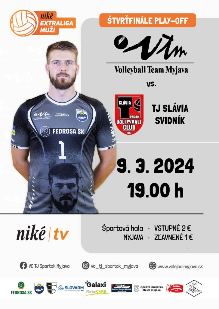 - sobota 9. 3. 2024, 19.00 h - TJ Spartak Myjava - Slávia Svidník, 1. štvrťfinále, Niké Extraliga mužov