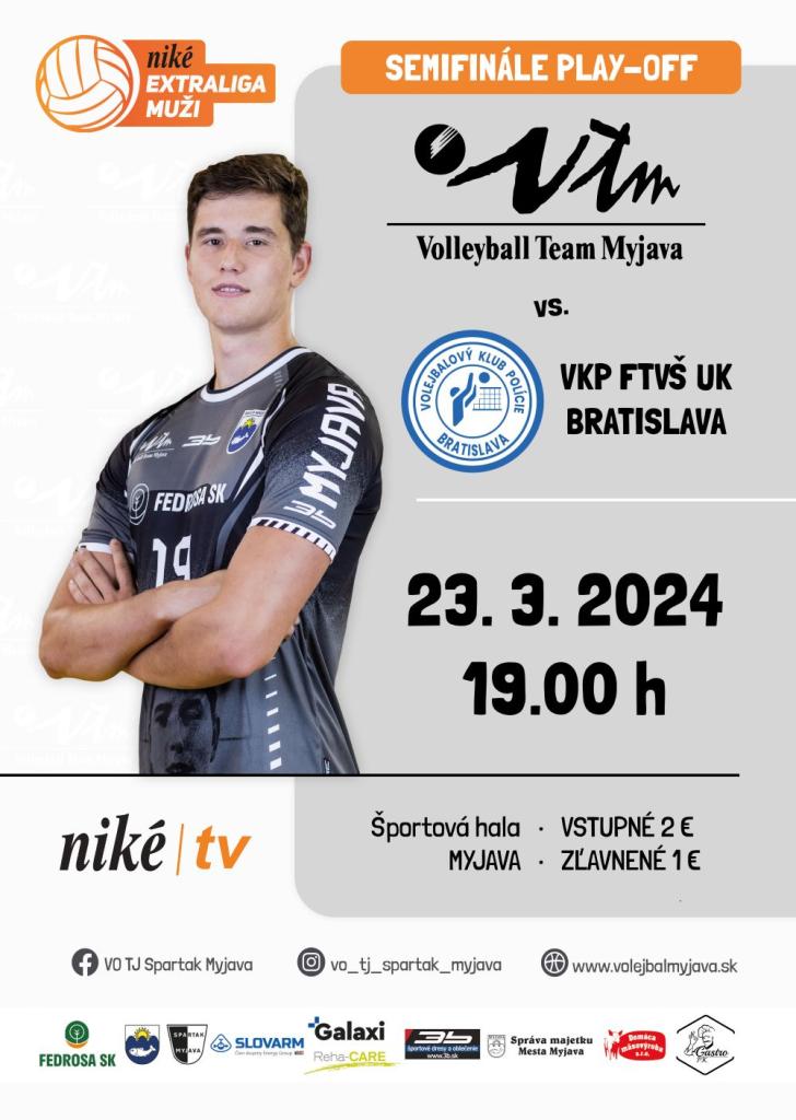 - sobota 23. marca 2024, 19.00 h, 2. zápas, TJ Spartak Myjava - VKP FTVŠ UK Bratislava